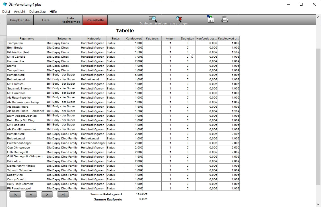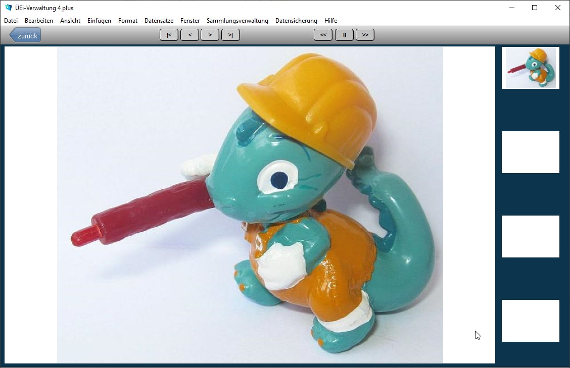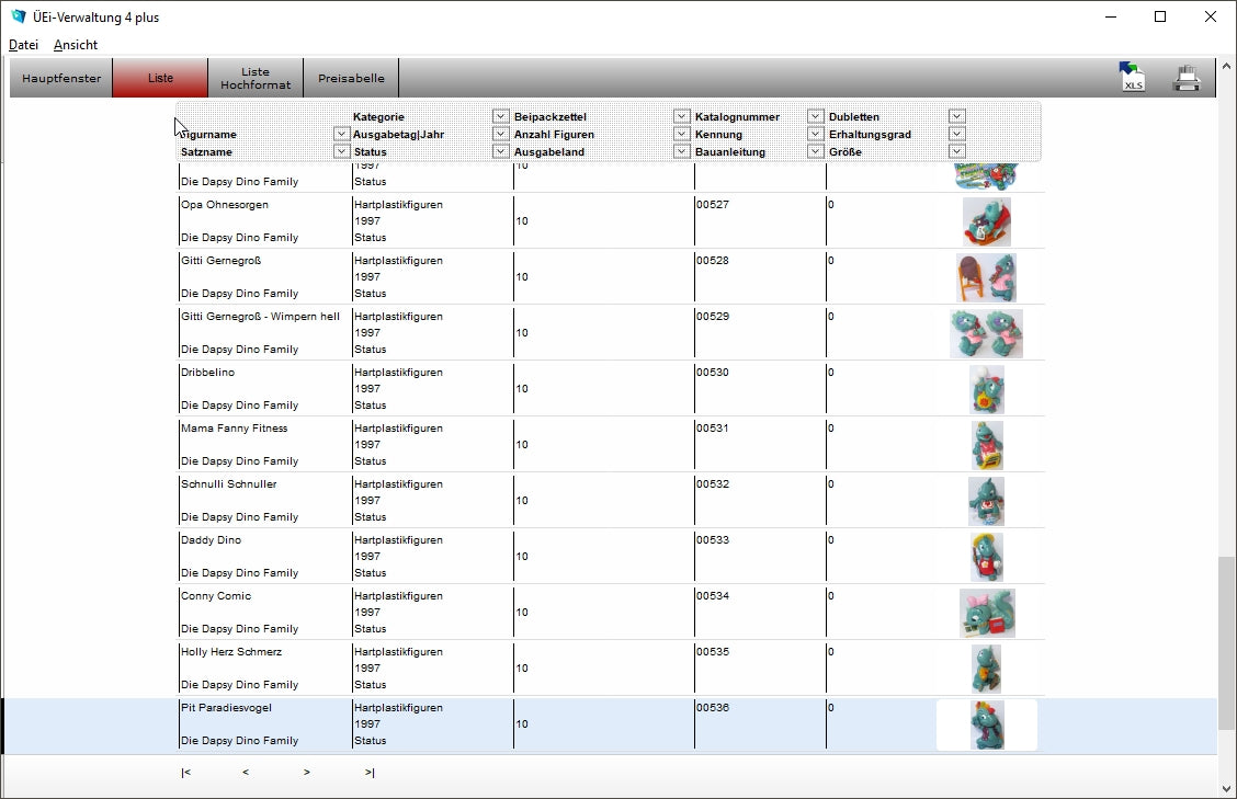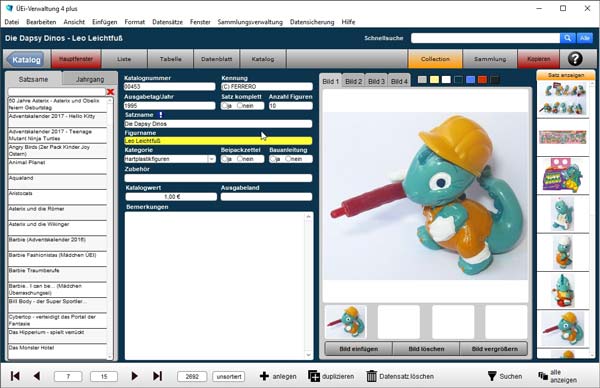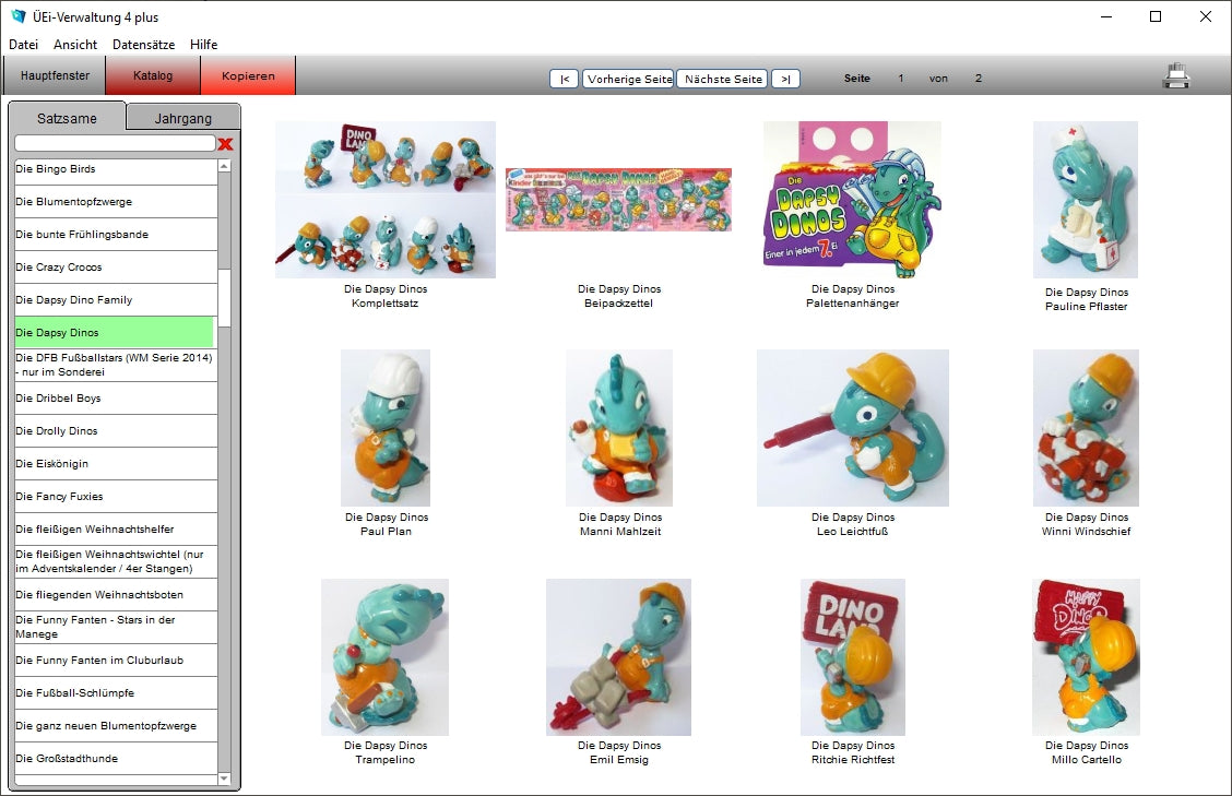 Die GS ÜEi-Verwaltung Plus wurde speziell für Sammler für ÜEi-Figuren entwickelt . Im Programmteil Collection finden Sie Daten und Bilder von mehr als 2500 Figuren. Diese Figuren können Sie per Mausklick in den Programmteil Sammlung kopieren. Dabei können Sie wählen ab Sie eine Figur einen Satz oder einen Jahrgang kopieren möchten. Über die Katalogansicht und die Schnellsuche finden Sie schnell die gewünschte Figur.