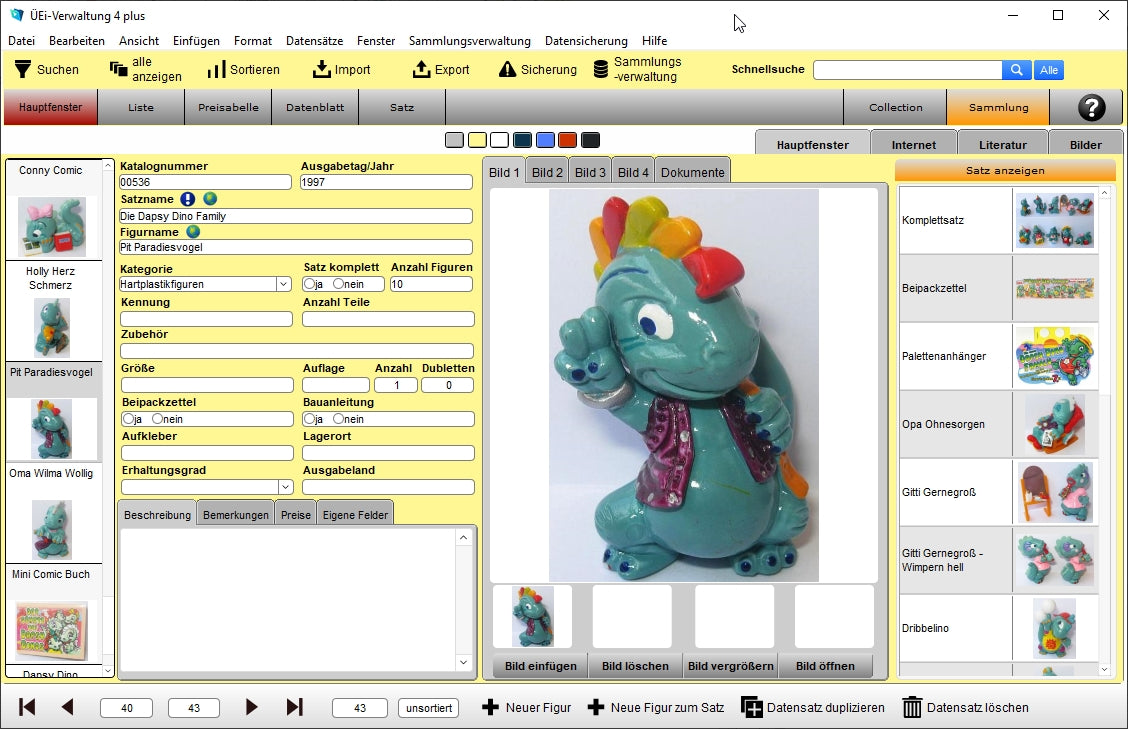 Sie können im Programmteil Sammlung bis zu 4 Bilder einfügen. Wenn Ihnen die zahlreichen Datenfelder nicht ausreichen, können Sie 4 Datenfelder für eigene Zwecke anlegen.